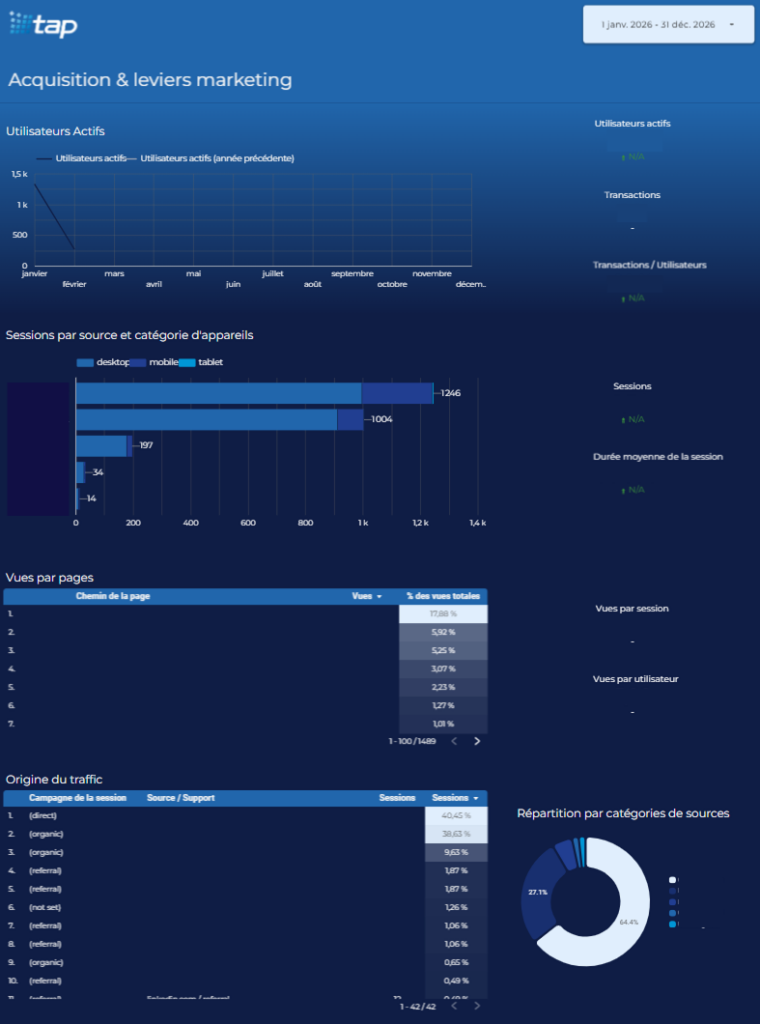 La Solution Calliweb : Nous avons déployé un dashboard de 4 pages conçu comme une vision 360° du comportement des utilisateurs et de la santé du business.